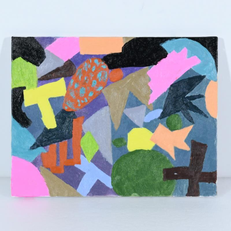 作者コメント:ポップなデザインのお菓子が売ってある店で、ある日突然ドロボウが入っていろんな種類のお菓子を盗んだ。店に残ったのはぐちゃぐちゃにされたお菓子だらけの床でした。その様子を切り取った絵です。